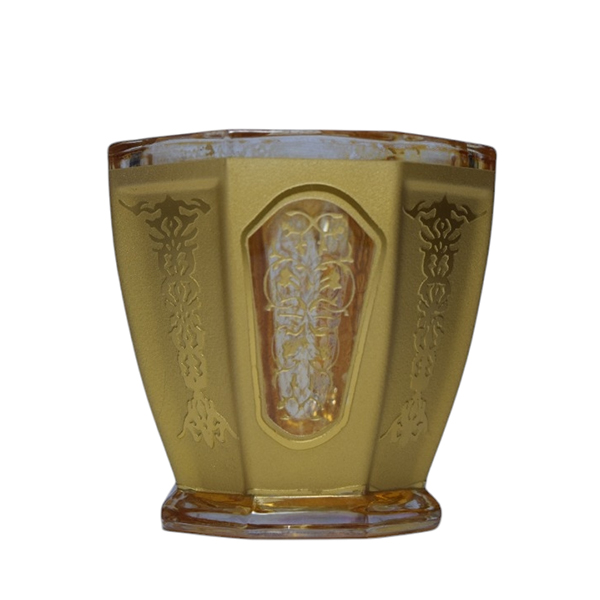 فنجان شیشه‌ای نفیس دسته دار با نقوش سندبلاست طلایی و طرح‌های برجسته ایرانی/اسلامی