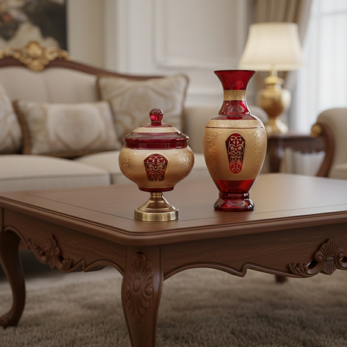 بدنه شیشه‌ای این گلدان با دقت بالا طراحی شده و نقوش اسلیمی طلایی آن، حس هنر دست و اصالت را به‌خوبی منتقل می‌کند. ترکیب رنگ قرمز و طلایی باعث شده گلدان سلطان به‌راحتی با دکوراسیون کلاسیک، مدرن و حتی سنتی هماهنگ شود و در فضاهایی مانند پذیرایی، سالن، ویترین یا میز کنسول بدرخشد.